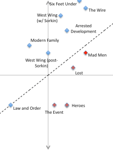 I’m assuming that the formula is constant throughout, which may not necessarily be true. The most challenging case is Modern Family, which scores very close to Six Feet Under, and higher than West Wing (w/Sorkin). Of course, I can’t be sure how precise your coordinate placements are.