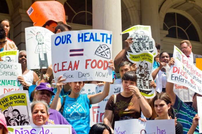 NEW YORK CITY—Flanked by a hundred-some supporters at a press conference on Wednesday, labor leaders and feminist activists announced a new initiative to push a longtime goal: passage of a citywide paid-sick-leave mandate. Wednesday’s event, held at noon on the steps of City Hall, marked supporters’ latest effort to move City Council Speaker Christine Quinn, who will decide the bill’s fate. It comes amid increased organized labor support for similar campaigns around the country—including a recently announced effort in Portland.